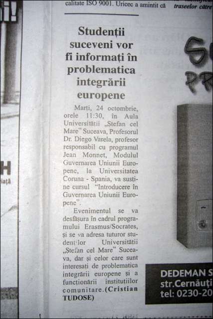 En octubre de 2006 Diego Varela visitó la Universidad "Stefan cel Mare" de Suceava, en cuya aula magna impartió una conferencia titulada "Introducere in Guvernarea Uniunii Europene", que versó sobre qué es la Unión Europea y cómo podemos estudiarla.